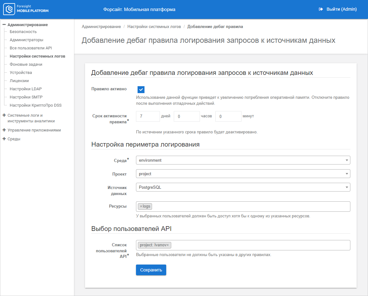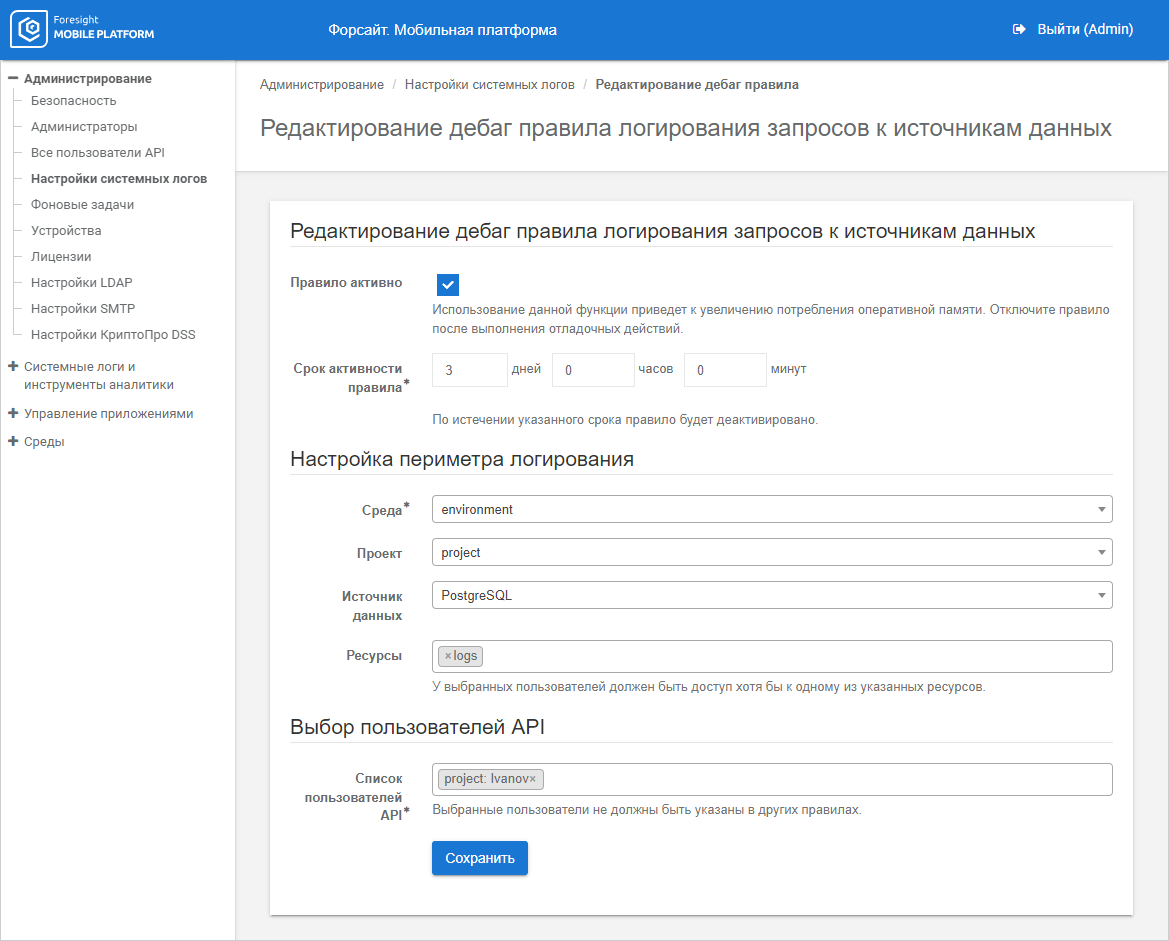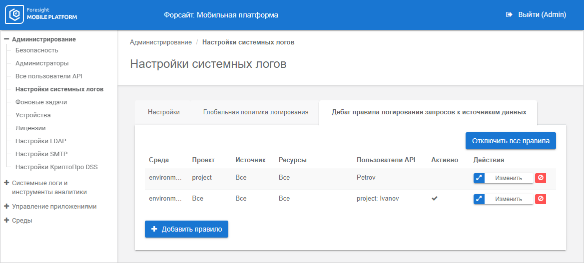 To execute advanced logging of data source requests, one can use the rules that determine debug info output on requesting the specified resource by a specific API user. Activation of rules initiates logging of events of the types: RPC API Request, Web Service Request, JSON Resource Request with the Debug status in the System Logs subsection. Add, edit, and delete rules events are also logged.