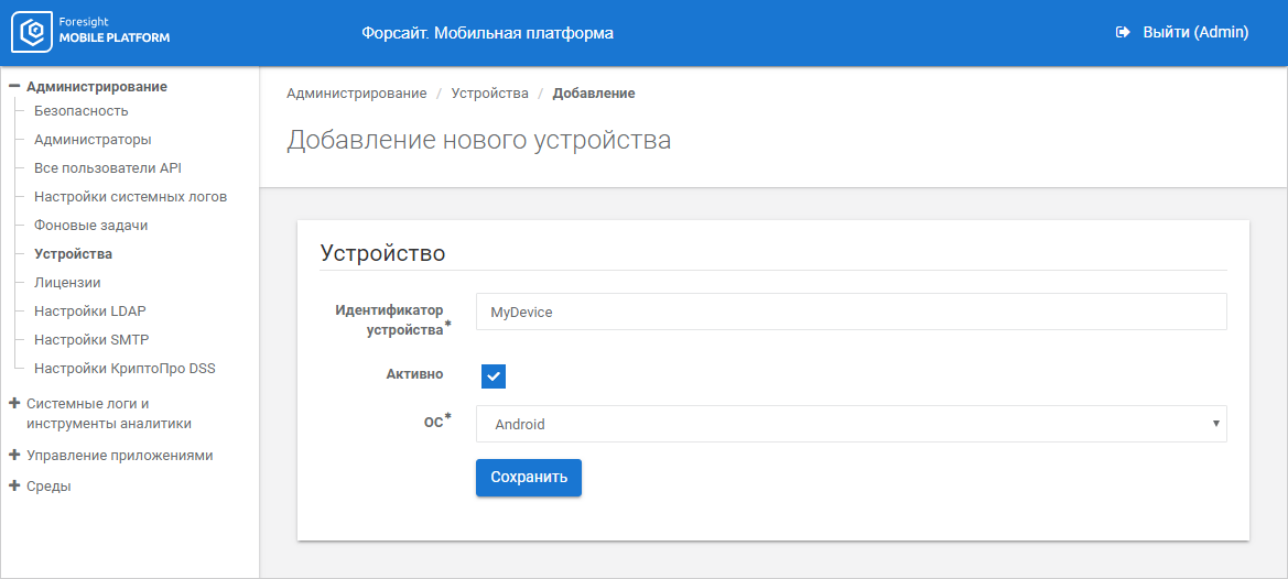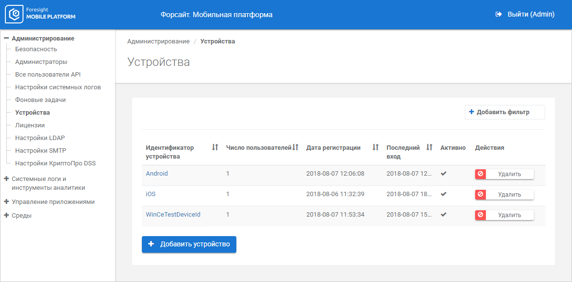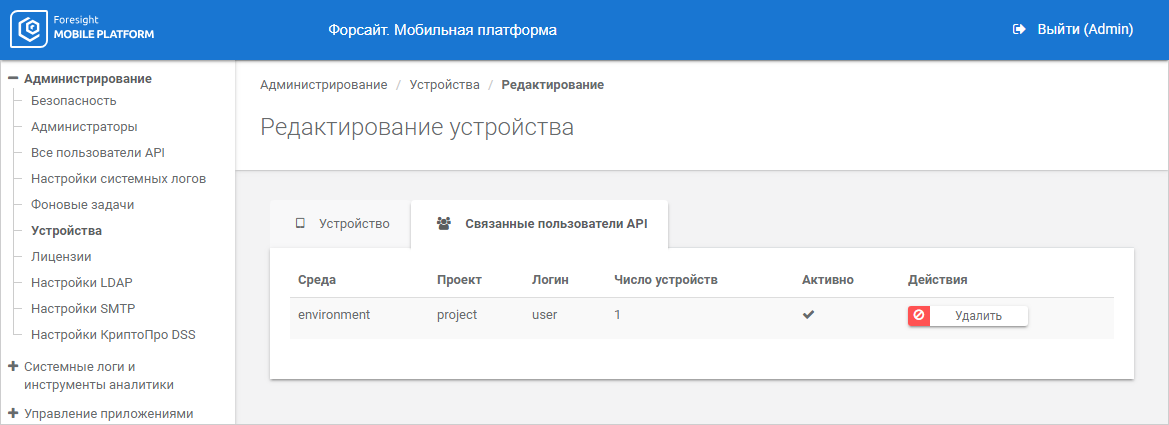 To delete the device, click the Delete button next to device identifier.