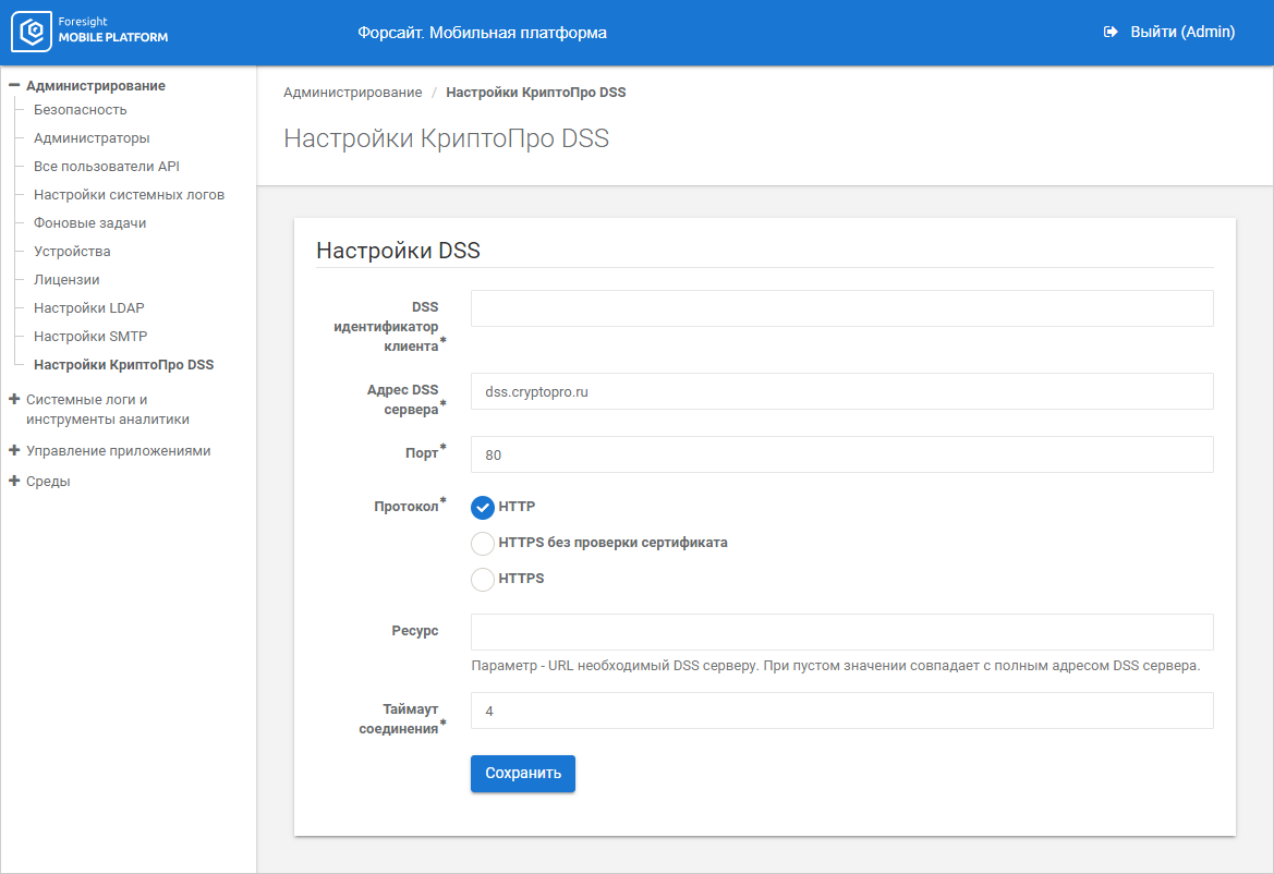 Client DSS ID. Specify client identifier in the CryptoPro DSS system. The box is mandatory.