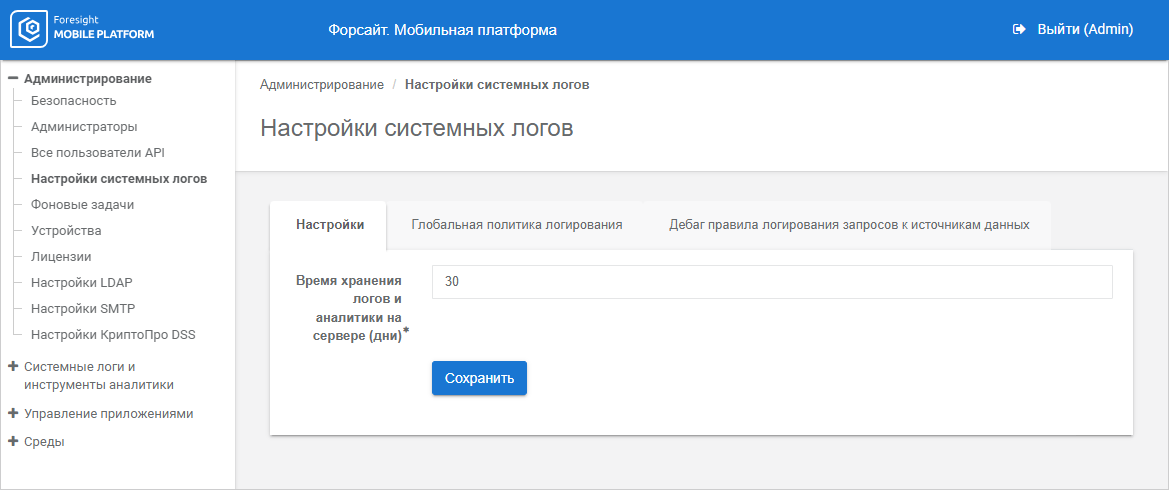 To set up log storage parameters on mobile platform server, use the Settings tab in the System Logs Settings subsection: