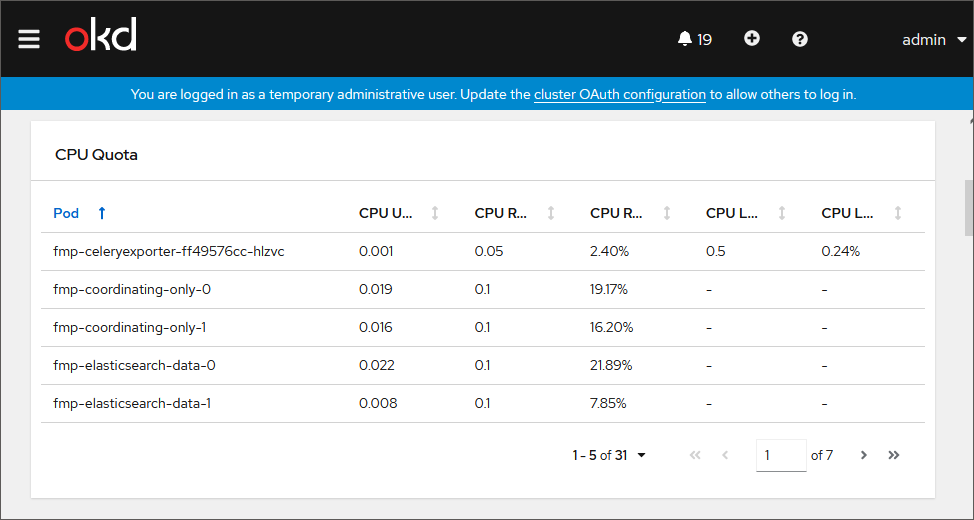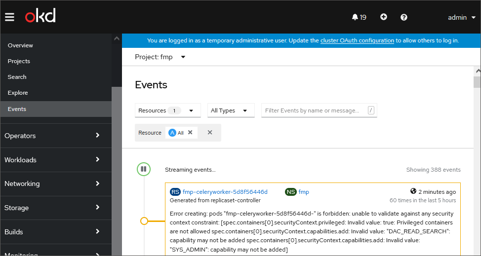 After executing the operation the information about cluster events is obtained. For details about cluster events detailing, see OKD documentation.