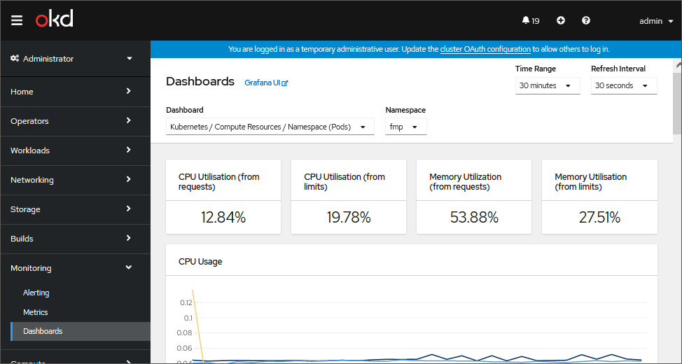 To view CPU and RAM usage by containers, open the Monitoring > Dashboards subsection and select the Kubernetes/Compute Resources/Namespace (Pods) dashboard in the Dashboards drop-down list: