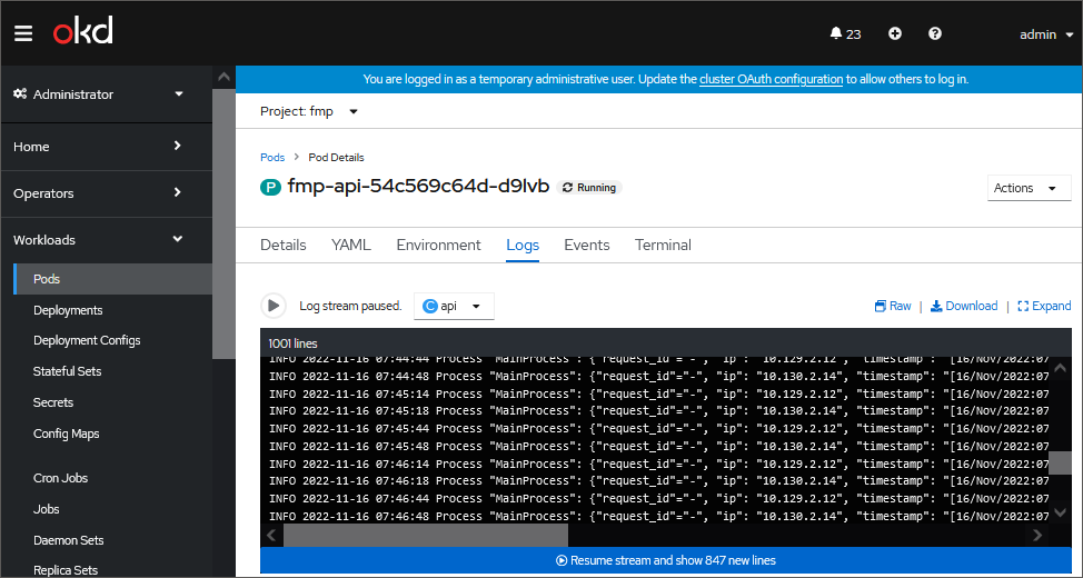 Analyze pod logs. The example of logs that indicate incorrect work of containers of the fmp-api pod (it is also actual for fmp-auth, fmp-dashboard, fmp-rpc, fmp-web):