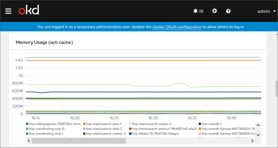 By default, a chart displays statistics of system resources usage volume by all pods. To show the statistic by a specific pod, hover the cursor on the chart point. A tooltip is displayed showing a pod name and corresponding resource usage value.