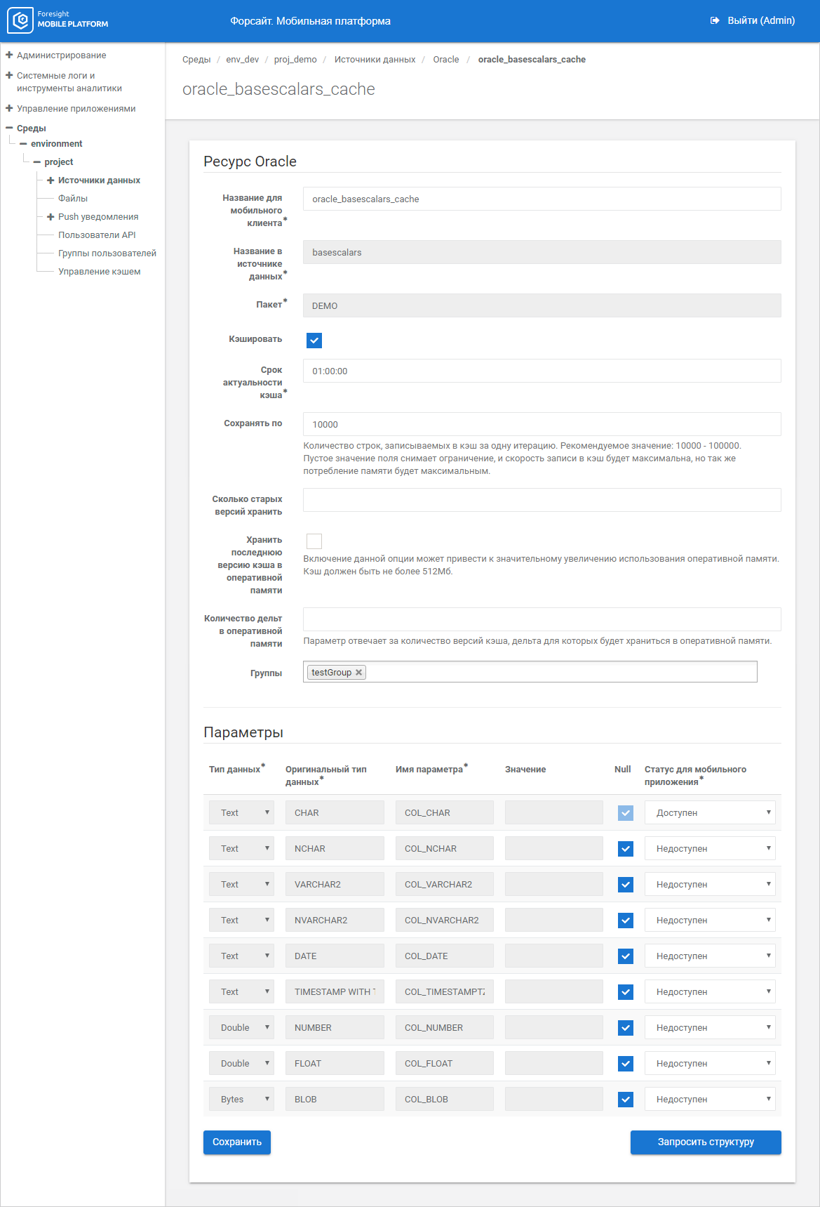 Change resource input parameters to get a data slice via requests, and click the Save button. The resource is added to the list of data source resources, and its input parameters are available to control resource cache.