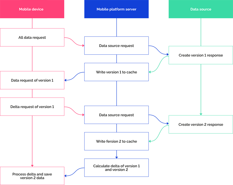 Delta is sent to a mobile device from a mobile platform server.
