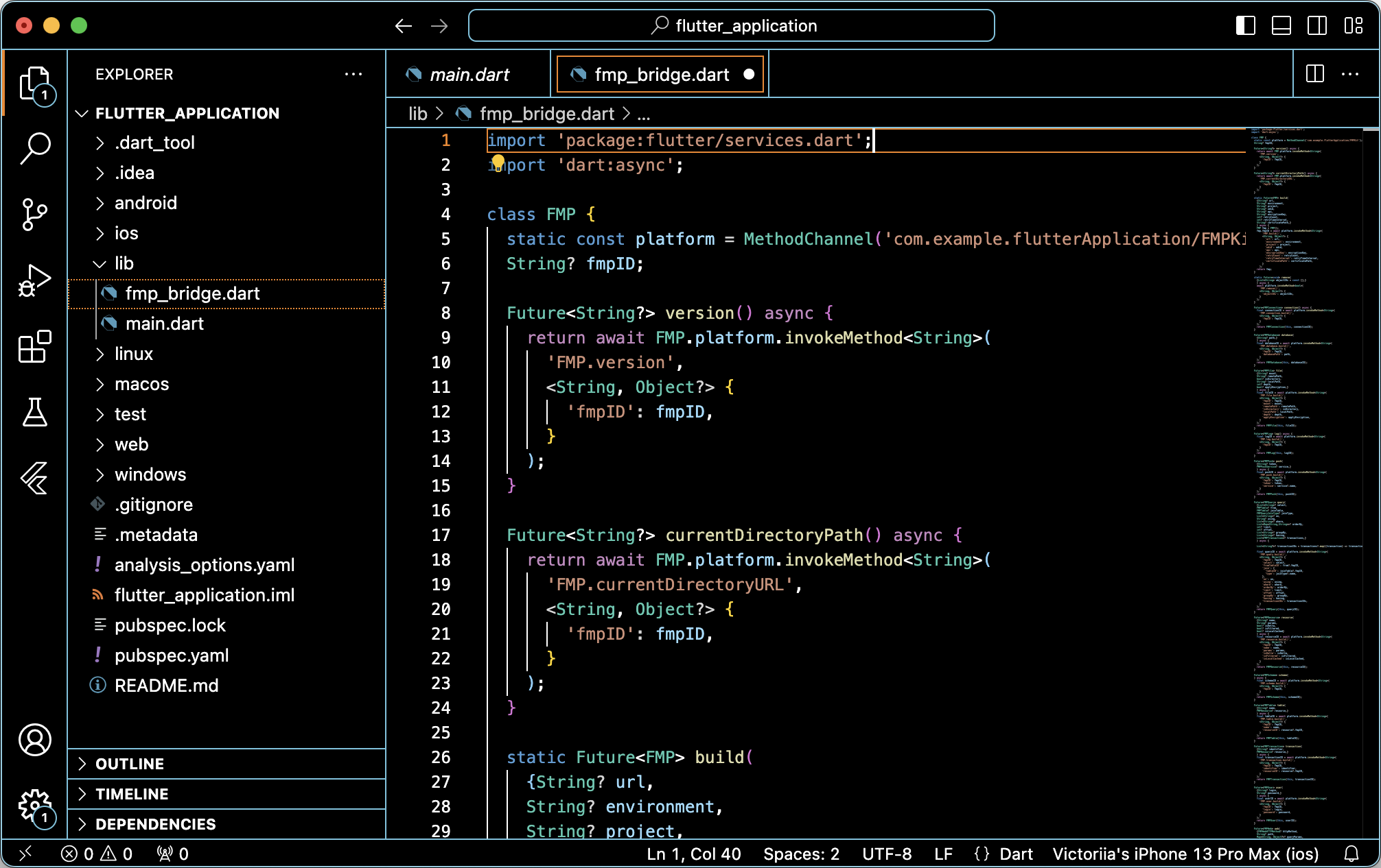 Open the fmp_bridge.dart file in the cross-platform part of the mobile application development project and specify channel name (com.example.flutterApplication/FMPKit) that was specified at Step 3 for the project's native part in the platform static property of the FMP class: