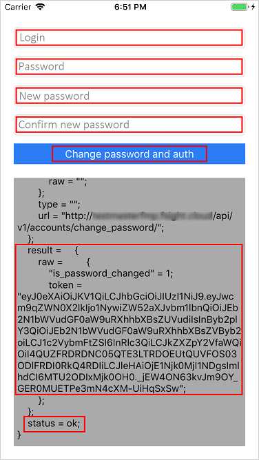 Clicking the button requests to execute authentication on a mobile platform server with password change. If the request is successful, a new token is returned.
