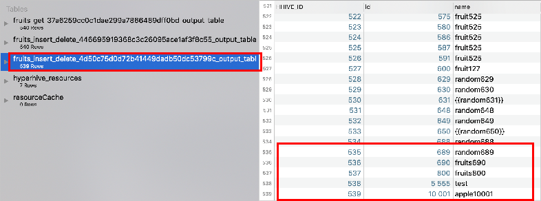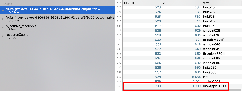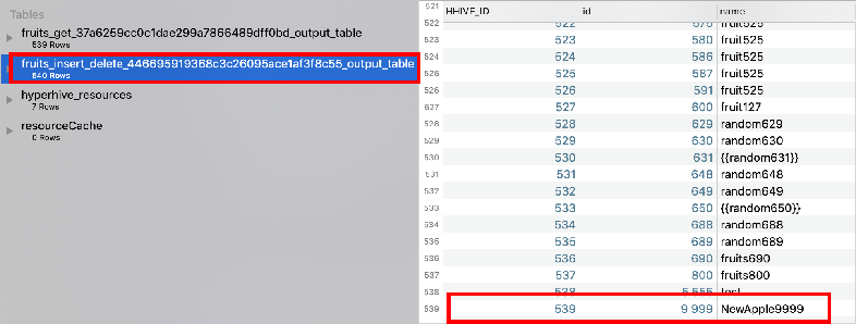 A new table is created in the local database for the fruits_insert_delete resource, in which a row with the 9999 identifier is added.