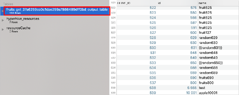 When a local database is opened, any appropriate editor displays the fruits_get_<some_stuff>_output_table table where: