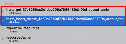 Clicking the button returns names of the tables created in the request to the fruits_insert_delete resource with the parameters {"upsert_rows": null, "delete_ids": [["9999"]]}.
