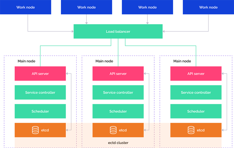 The scheme displays the work of main cluster nodes and their interaction with work nodes and incoming requests via special services with load balancer support.