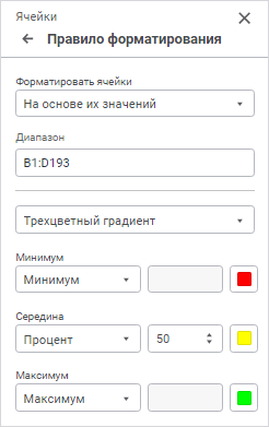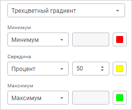 трёхцветный градиент. Форматирует значения в ячейках на основе трёх цветов: цвета для минимального значения, цвета для среднего значения и цвета для максимального значения. Промежуточные цвета вычисляются автоматически, исходя из значений в ячейках.