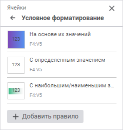 Доступны правила форматирования ячеек: