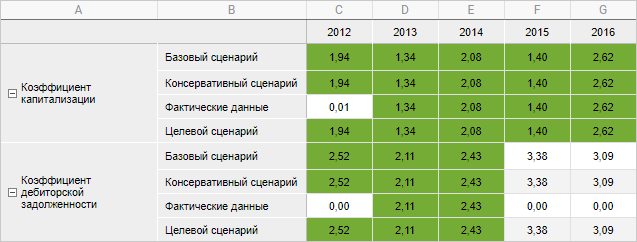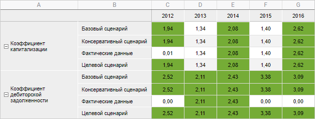 Пример условного форматирования, в котором ячейки с минимальными значениями красные, а с максимальными зелёные. Цвета для промежуточных значений вычисляются автоматически: