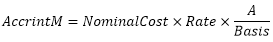 AccrintM( Issue, Settlement, Rate[, NominalCost[, Basis])