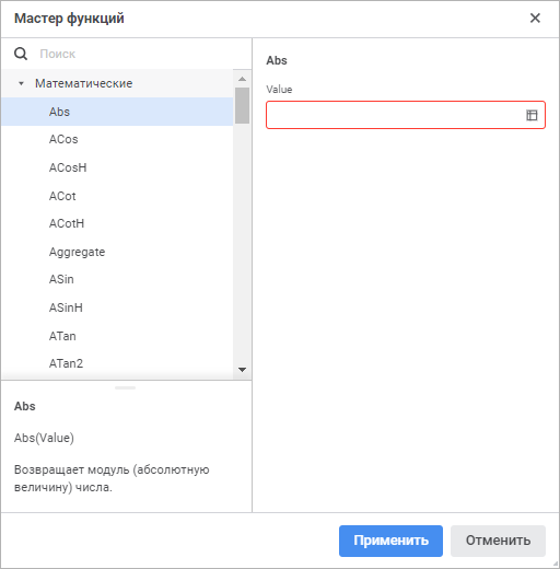 Для быстрого поиска функции введите её наименование частично или полностью в строку «Поиск».