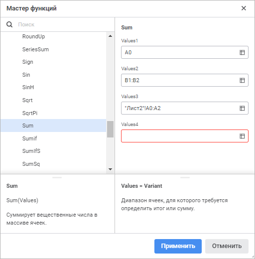 Задайте значения параметров выбранной функции в правой части окна мастера функций.