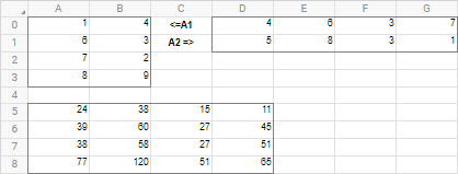 Результатом является массив с таким же числом строк, как A1 и с таким же числом столбцов, как A2.
