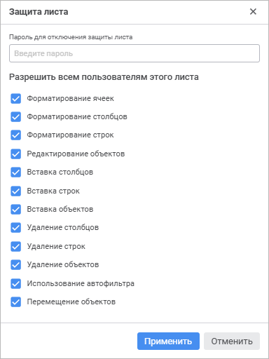 После определения набора действий нажмите кнопку «Применить». Если пароль был не задан, то лист сразу будет защищён.