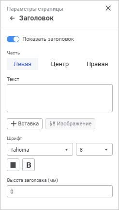 Показать заголовок. По умолчанию переключатель переведён в активное состояние. Доступна настройка заголовка и его отображение на листах отчёта;