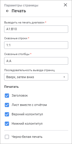 В полях «Сквозные строки» и «Сквозные столбцы» задайте диапазоны строк и/или столбцов, которые необходимо вывести на каждый печатный лист.