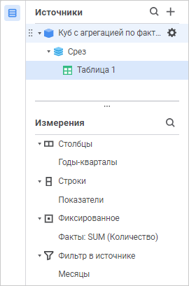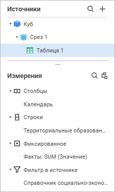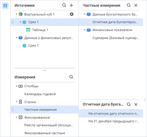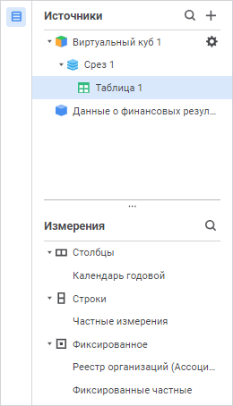 Панель «Фиксированные частные» содержит список зафиксированных частных измерений с их принадлежностью к источнику данных.
