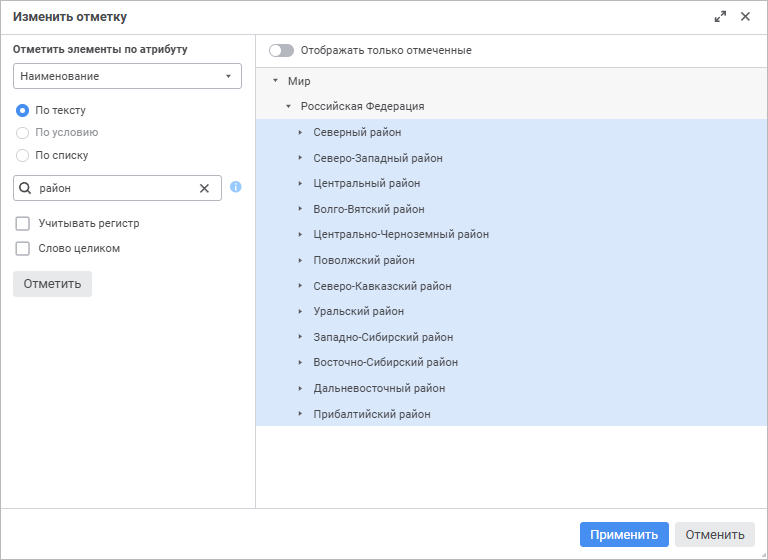 Примечание. Для конструируемого среза работа с элементами измерения боковика или шапки таблицы выполняется в конструкторе отметки в рабочей области отчёта. Остальные измерения таблицы настраиваются на панели отметки и панели управления отметкой.