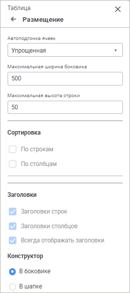 Для типа области «Боковик» сортировка доступна только по строкам, а для типа области «Шапка» - только по столбцам. Для отображения значков сортировки в боковике/шапке установите флажок «Отображать значки сортировки».