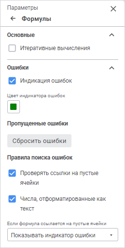 Сбросить пропущенные ошибки. Нажмите кнопку для возврата индикации тем ячейкам, которые содержали ошибки в формулах, но были пропущены пользователем при помощи команды «Пропустить ошибку».