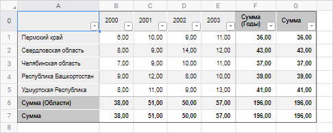 Сортировка и фильтрация данных в столбцах доступна в таблице, неиспользующей срез, и в таблице, построенной на срезе.