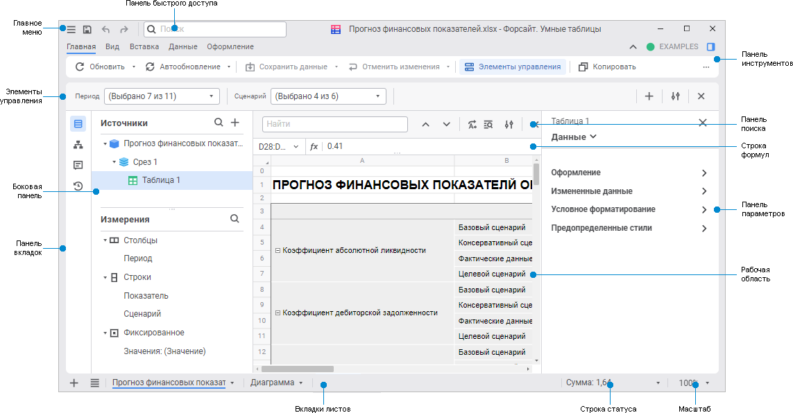 Окно продукта «Форсайт. Умные таблицы»: