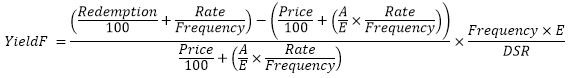 YieldF(Settlement, Maturity, Rate, Price, Redemption, Frequency[, Basis])