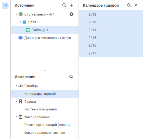 Панель «Фиксированные частные» содержит список зафиксированных частных измерений с их принадлежностью к источнику данных.