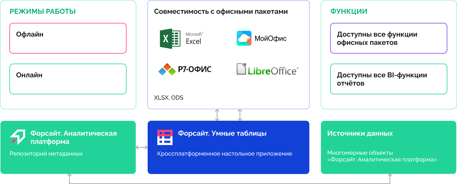 Программный продукт «Форсайт. Умные таблицы» - это кроссплатформенное настольное приложение, предназначенное для создания отчётов со сложным форматированием, использования BI-инструментов и обеспечения совместимости с отечественными офисными приложениями.
