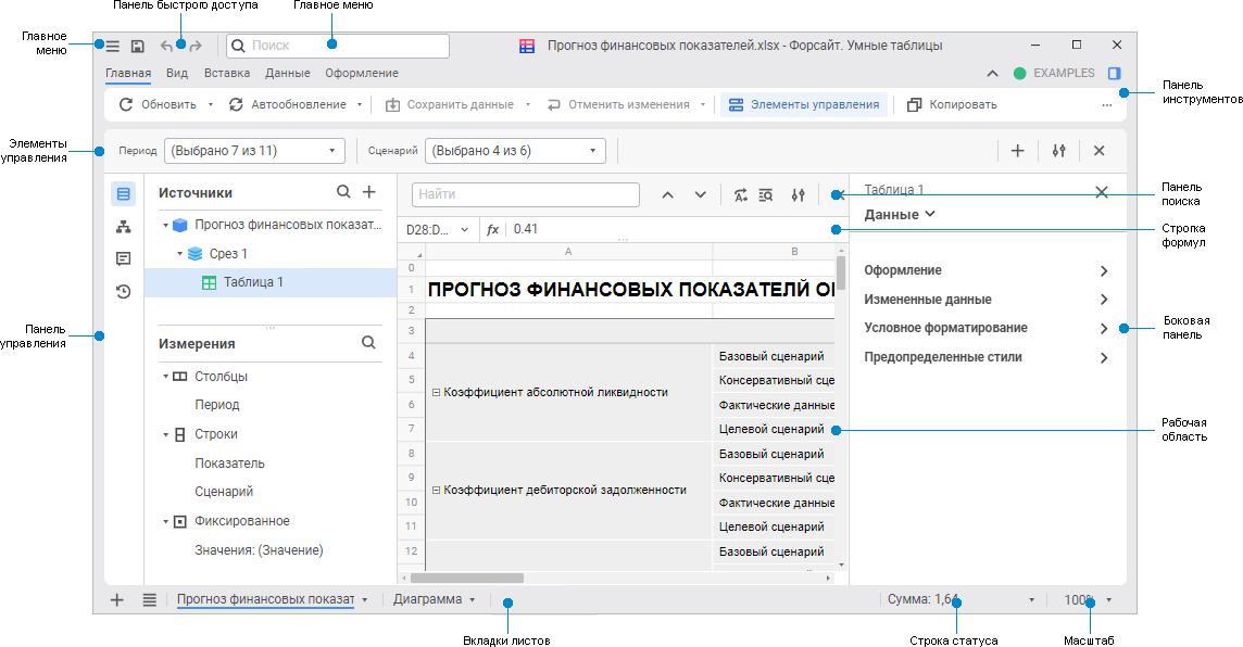 Окно продукта «Форсайт. Умные таблицы»: