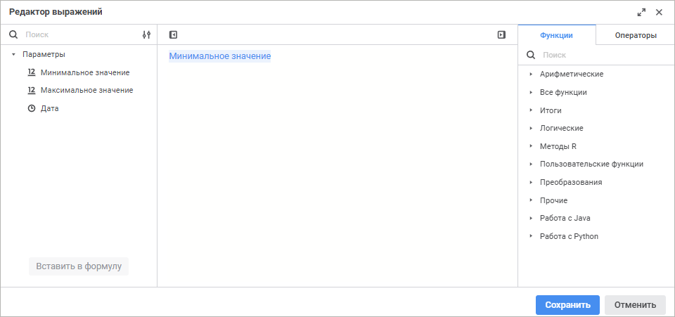 Функции и операторы для работы с параметрами вставляются с помощью вкладок «Функции» и «Операторы» на боковой панели.