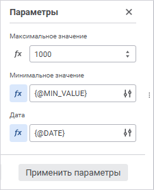 Для задания значений параметров источников данных или настройки связи с параметрами отчёта используйте панель «Параметры».