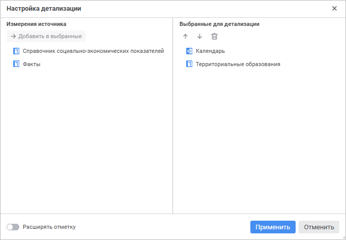 Для настройки доступных измерений при детализации или обобщении, а также поведения отметки элементов используйте диалог «Настройка детализации»: