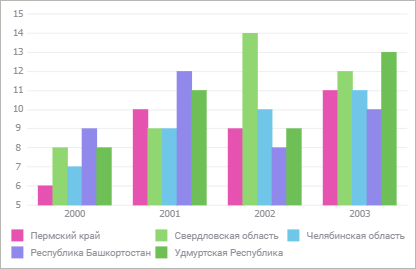 На гистограмме значение каждого элемента отображается в виде горизонтального (вертикального) столбика, длина которого пропорциональна значению элемента. Для каждой из групп данных отображается свой набор столбиков, каждый ряд данных обозначается отдельным цветом, указанным в легенде.
