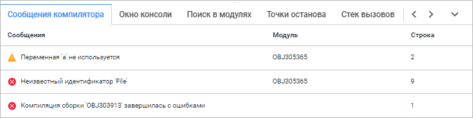 выберите панель «Сообщения компилятора» в области панелей;