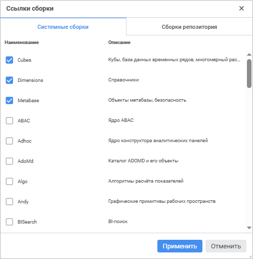 на вкладке «Системные сборки» представлены список и краткое описание системных сборок среды разработки. Для подключения сборки необходимо установить напротив неё флажок: