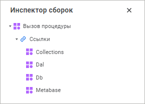 На панели/окне «Инспектор сборок» отображается древовидная структура, содержащая все сборки репозитория и системные сборки, подключенные в текущей сборке/модуле: