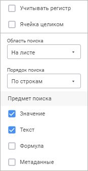 Значение. По умолчанию флажок установлен. Поиск будет осуществляться по значениям в ячейках;