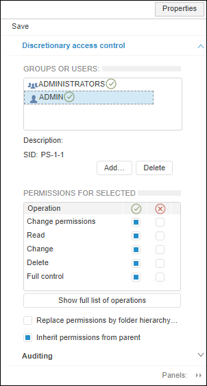 The Properties side panel in the web application and the Access Control Settings dialog box in the desktop application: