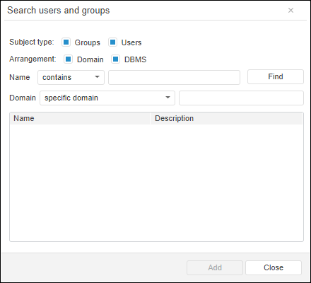 The advanced search of users and groups includes determining the domain, in which search is to be executed, and is available if the following supported DBMS: PostgreSQL/Postgres Pro, Oracle, Microsoft SQL Server.