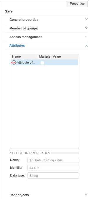 To add or edit value to added attributes of users, use the Attributes tab in the Properties side panel in the web application and in the User Properties dialog box in the desktop application.