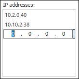 IP Addresses. This list contains IP addresses, from which the user is allowed to access. IP address consists of four groups of decimal numbers separated by points. The first group must include a number between 1 and 223, other groups must include numbers between 0 and 255.