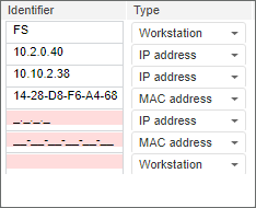In the web application click the Add button below the list. A new element is added to enter a workstation/with mask to enter IP address or MAC address. After the address has been entered, press the ENTER key or move the cursor to another component. To cancel entering address, click the Delete button.