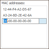 MAC Addresses. This list contains MAC addresses, from which the user is allowed to access. MAC address consists of six groups of hexadecimal numbers separated by "-" (dash). It is possible to enter only numeric values and the following characters: "A", "B", "C", "D", "E", "F".